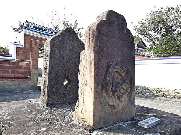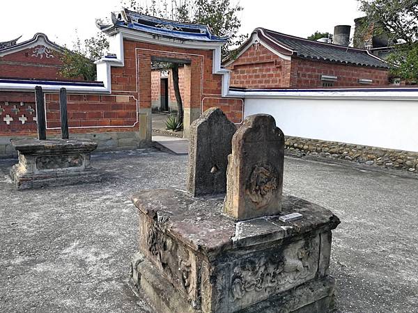 在外埕有四座旗桿座,擺佈各有兩個,靠外面的是旗桿架是石座,後面的則是木座翻譯